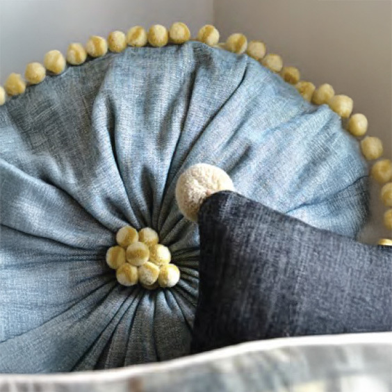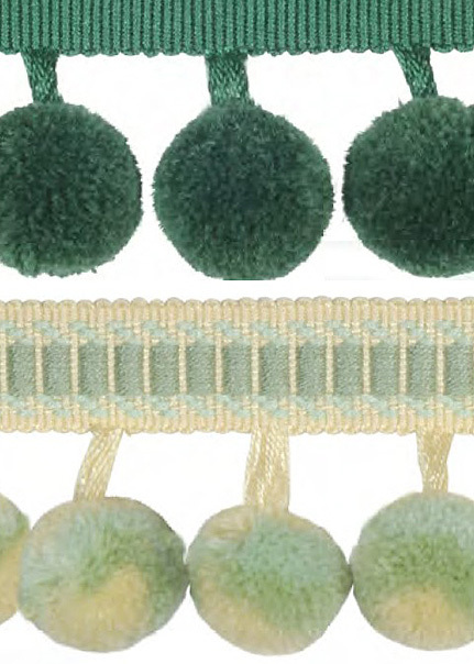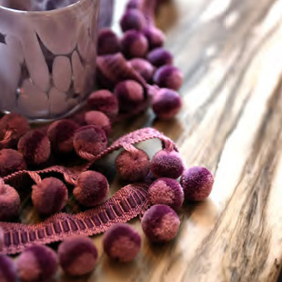 コロコロした形をクッションの辺やカーテンの裾に取り付けると、とても可愛らしい印象を与えます。粒が整然と並ぶことで生まれる規則性が目を引き、粒の向きが変わったり揺れることで、さらに軽やかな印象が加わります。