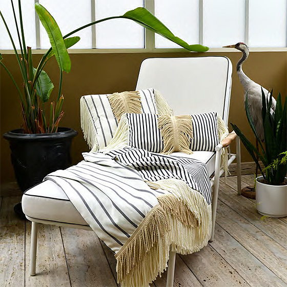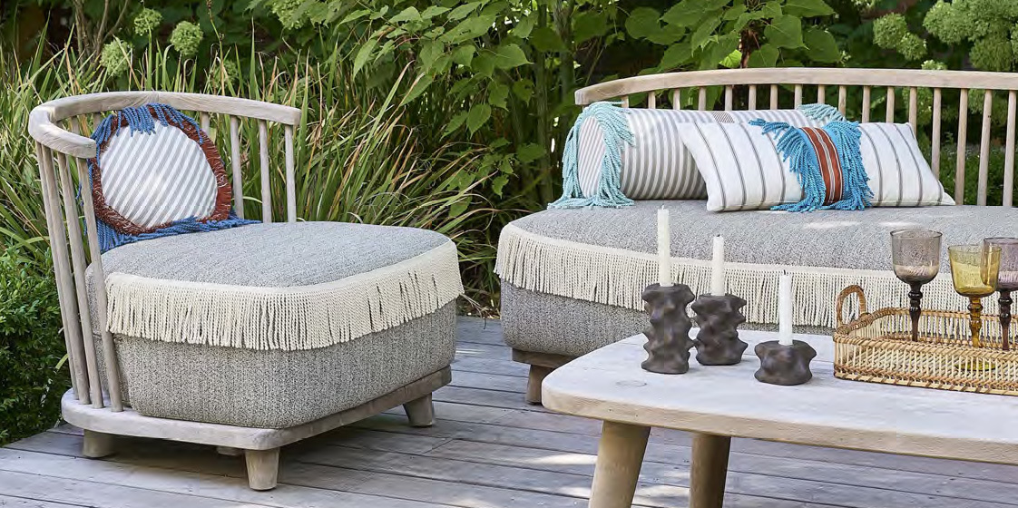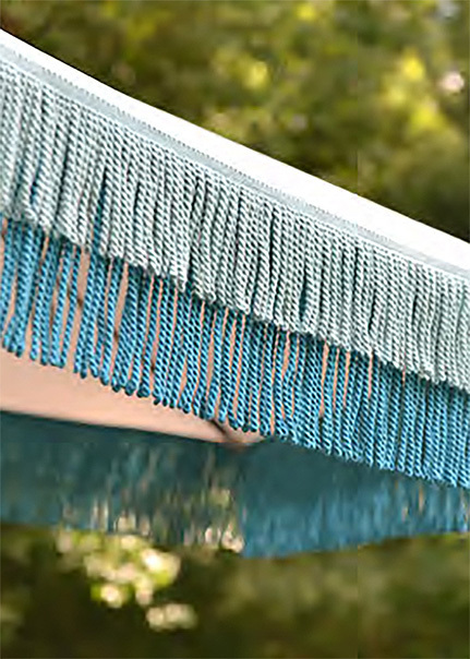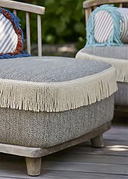 上記のツイストフリンジを、素材をアクリルに変えアウトドアに向くタイプも発表されています。紫外線や湿気に対する耐性があり、色あせにも配慮されています。エレガンスと耐久性を兼ね備え、屋内外のインテリアを美しく演出します。