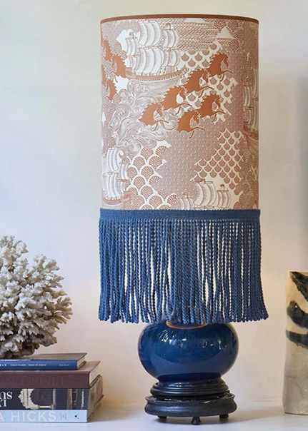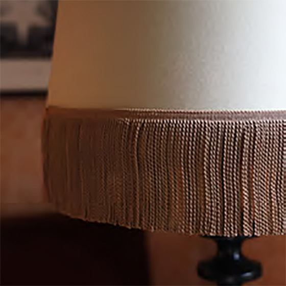 無地のランプシェードに取り付けると、まるで金属のような美しい輝きを放ちます。ベルベットとの相性も抜群。生地の柔らかさや美しさを引き立て、品格が生まれます。 |