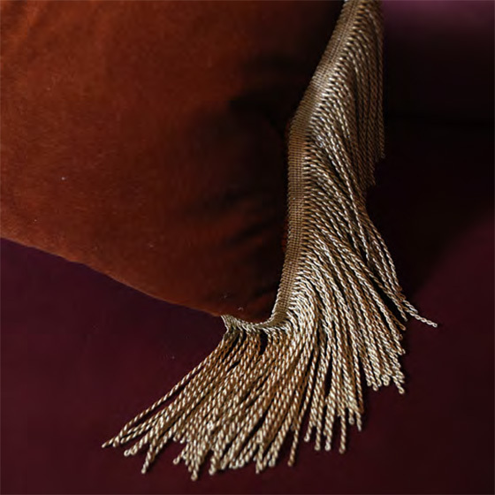 フリンジの上部がテープのように平坦になっているため、縫い目を隠す必要がなくクッションの表面にそのまま取り付けることが可能です。房の動きがリラックスした雰囲気を演出します。幅広のブレードと組み合わせることで、無地の生地が劇的に変わります。