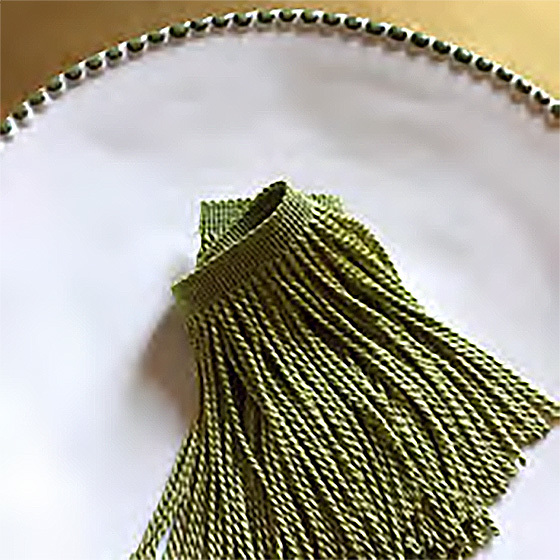 ツイストが持つ力強さは、際立った存在感を生み出し、イスやクッションに取り付けると視線を引き寄せます。フリンジの色や光沢の美しさは上品さを醸し出し、わざと目立たせることで優雅な遊び心を感じさせます。