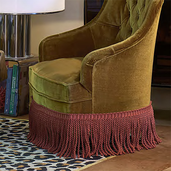 8mmの太さのあるツイストフリンジは、見た目に大きなインパクトがあり、力強い個性を添えることができます。太さによる豊かな質感と端正なドレープは、クラシックなテイストを再現したインテリアや、マキシマリストスタイル、洗練されたコンテンポラリースタイルに最適です。