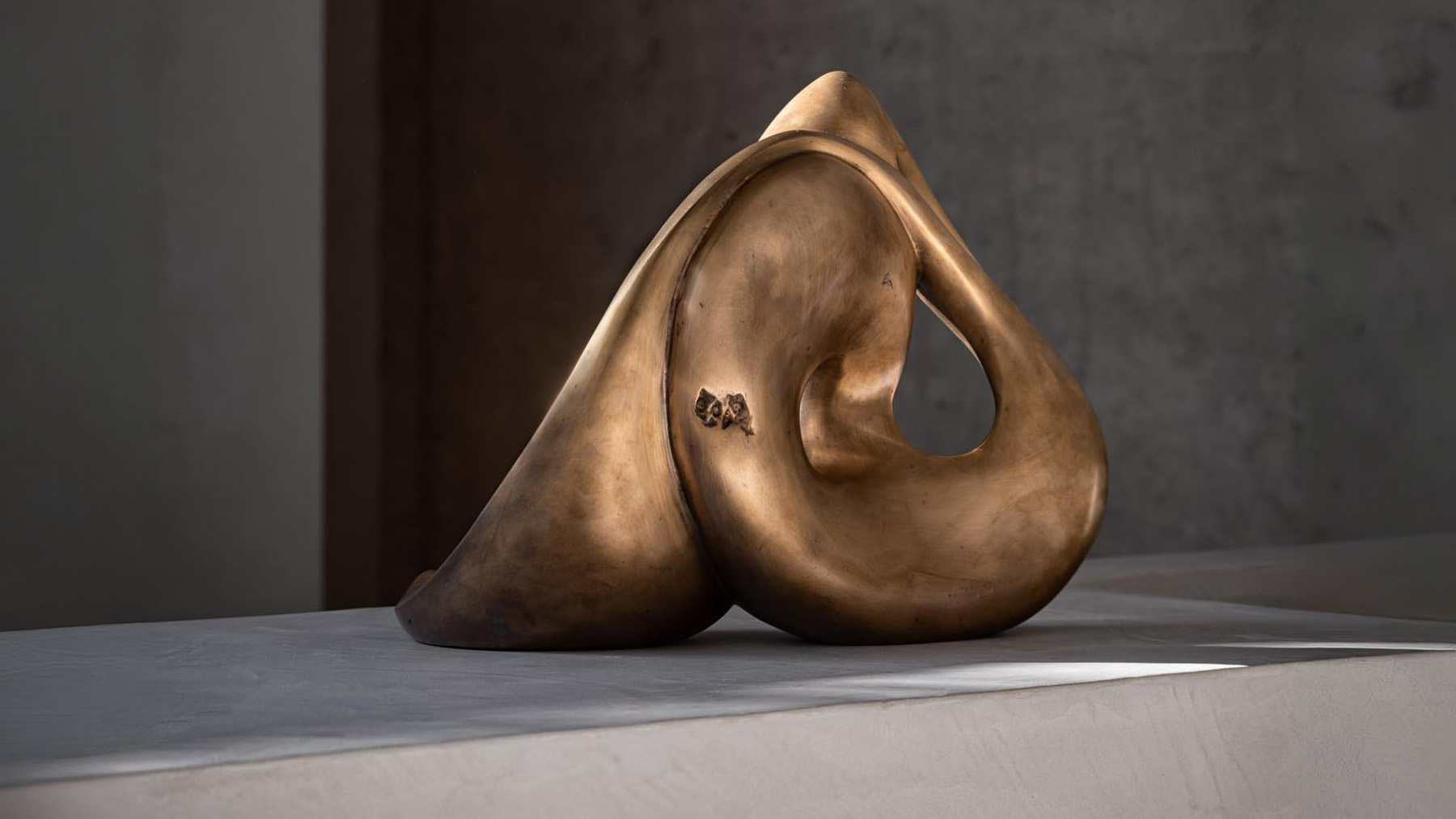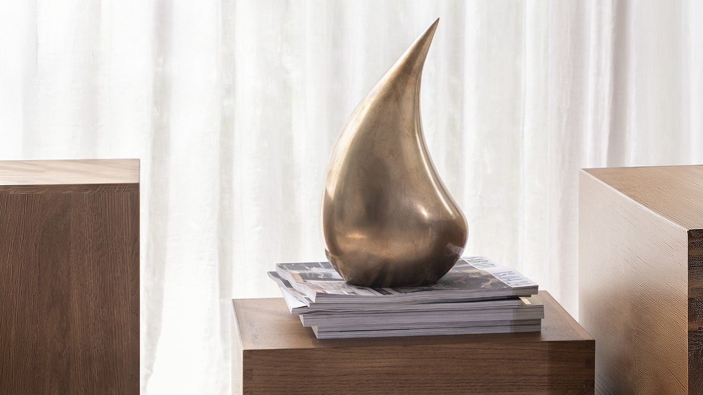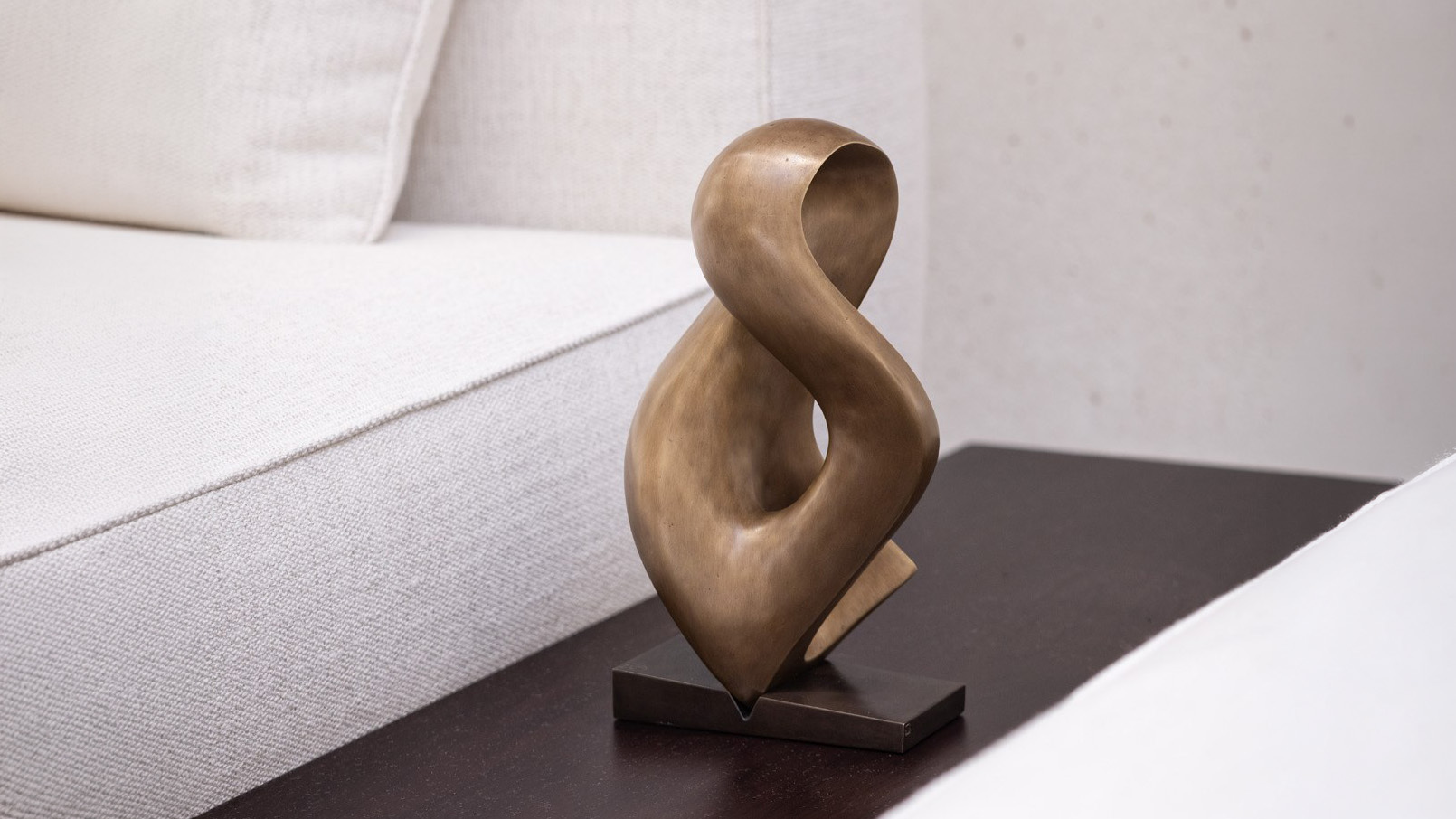 不完全な二人が融合し、相乗的な存在へと昇華する様子をイメージしたというこの作品は、内部に設けられた空間が重厚な素材に軽やかなリズムを与え、静と動が共存する美しさを生み出しています。光を受けて移ろう陰影が、このブロンズ彫刻に呼吸のような生命感をもたらし、空間に静けさと品格を添えます。