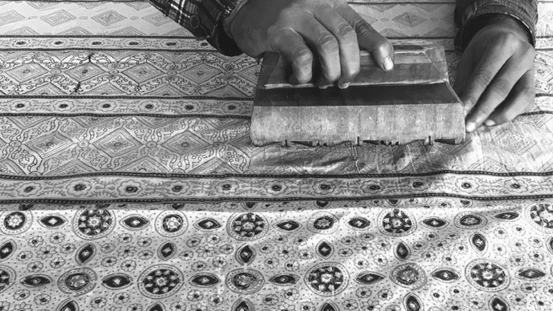布に施された版画ともいえる技法で、版木に模様を彫り、彫った版に色をつけ、布に押し当てて模様を転写させます。浮世絵などの木版画と似た工程ですが、絵と違い表面に色を乗せるのではなく、洗っても落ちないよう、染料を繊維にしみ込ませ定着させる必要があり、また手で扱えるサイズの版木を繰り返し押していく方式で、手間も技術も必要で大変貴重なものでした。