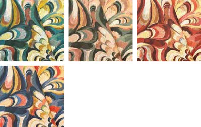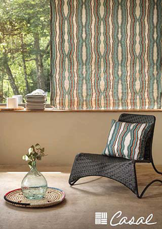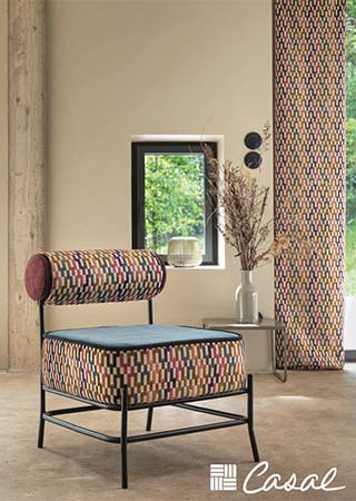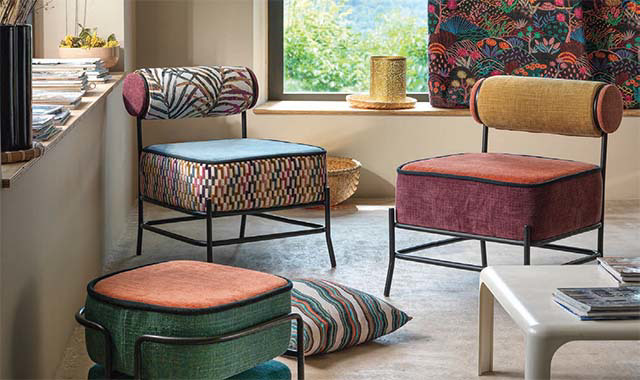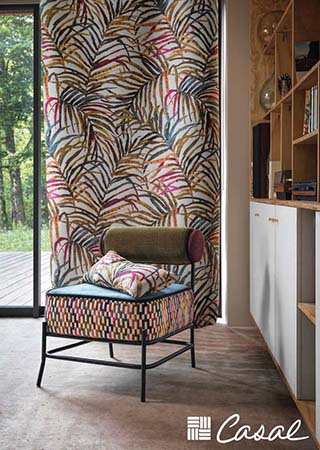 ヤシの木をモチーフにしたジャカード織の「ARECA」は、色とりどりの糸を巧みに織り交ぜて、エキゾチックな雰囲気をエレガントに表現しています。大きなリピートで大胆なパターンを描き、豊かな色使いにすることで、リゾート感が強くなりがちなモチーフを、深みのある明るいデザインに仕上げています。