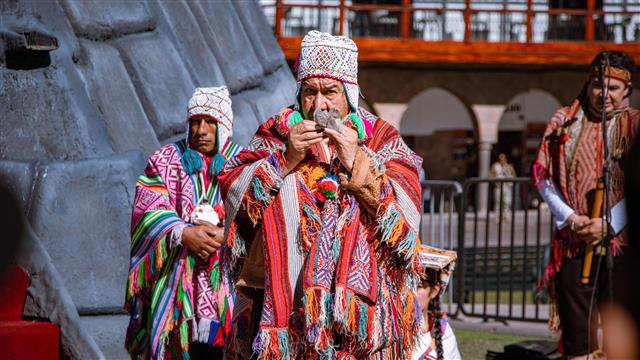 祭りでは王や貴族に扮した人々の行進が行われ、パンフルートや打楽器を使った演奏や踊りや、生贄の儀式などが行われます(現代は演出としての再現)。色鮮やかな羽飾や民族衣装を身に着けた人たちで、温かみと活力のある色彩であふれます。