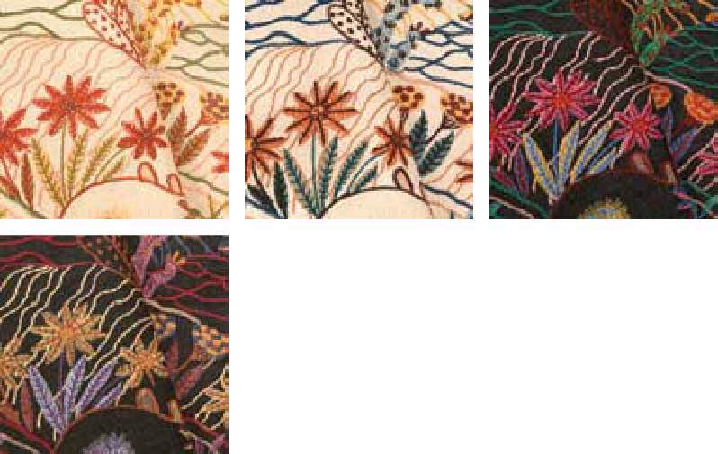 色合いも鮮やかさとナチュラル感を兼ね備えたエキゾチックさを感じさせる絶妙な配色です。一つ一つの糸とモチーフが、有機的で文化的な要素と洗練されたモダンさが融合した世界へと私たちを誘います。