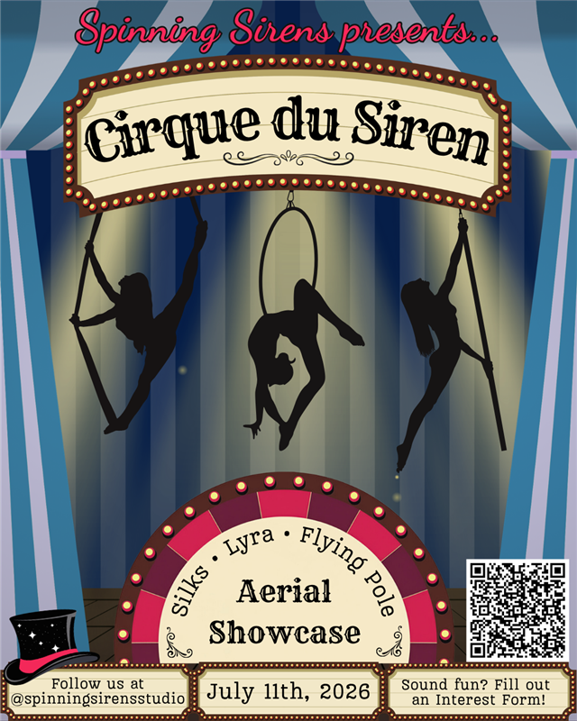 To continue the celebration of our first year of magic, strength, and community, we are hosting an aerial arts showcase on July 11th, 2026. We would love to bring more interest and visibility to the aerial side of the studio. Whether you are a "Baby Siren" who just started or a seasoned pro, we want YOU on our stage!