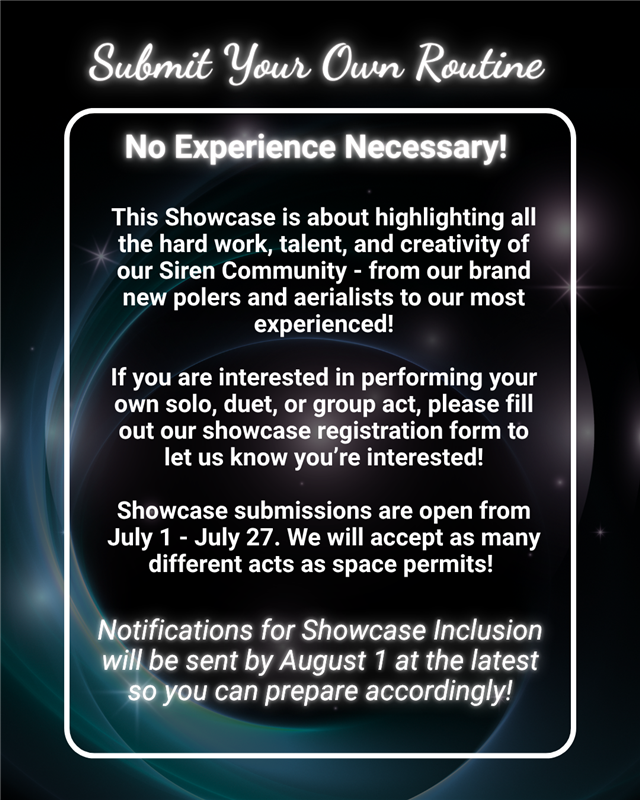 Whether youâre a brand-new baby Siren or a seasoned spin queen, our student showcase is your chance to step into the spotlight and let your talent shimmer. Show off your strength, creativity, and flair in front of your fellow magical mermaids!