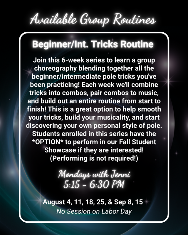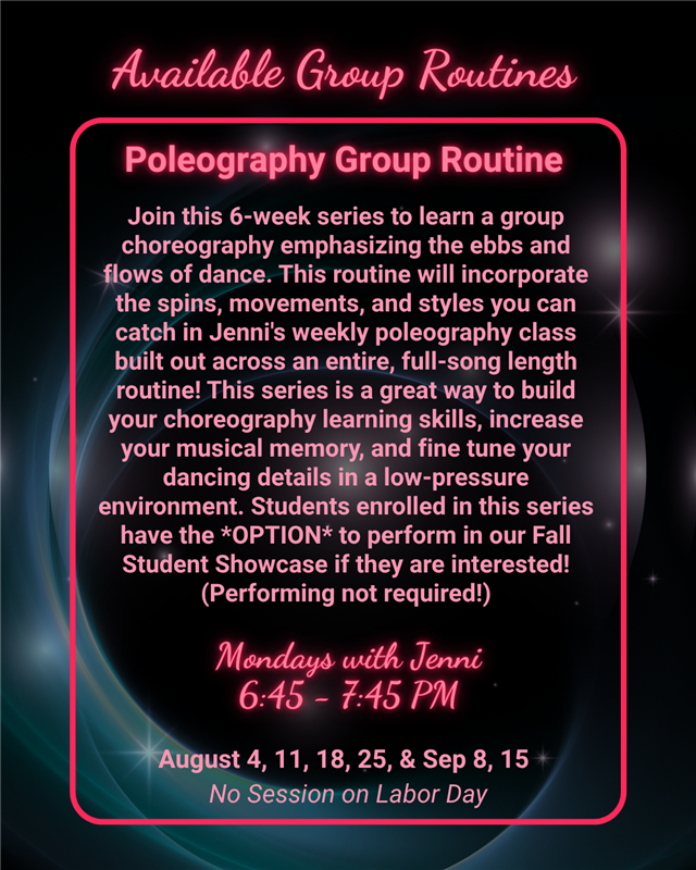 𩰠Ballerina Shapes and Transitions with Ann Elevate your artistry and refine your lines in this exquisite ballet-inspired pole class, focusing on elegant shapes, fluid transitions, and enhanced body awareness. Cultivate softness, strength, and serene movement with each spin.