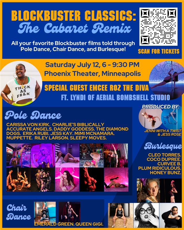 Her next show Blockbuster Classics: The Cabaret Remix is coming up on Saturday July 12th at 6PM in Minneapolis! This show features 18 acts of pole dance, chair dance, and burlesque all taking a spin on a famous Blockbuster hit! Plus don't miss national pole champ Lyndi from Aerial Bombshell Studio and guest emcee Roz the Diva! If you and your friends are looking for a fun summer event, you won't want to miss this production!