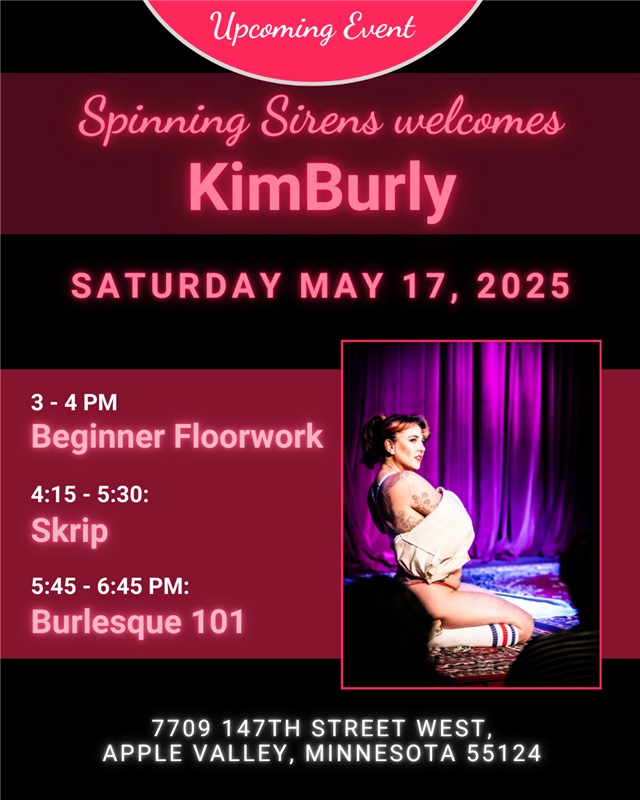 This month we are welcoming our first out-of-state instructor to Spinning Sirens Studio, KimBurly! KimBurly is started her pole dance journey more than a decade ago in the club, and today she is a national pole dance and burlesque performer and competitor who specializes in slow, sultry, low-flow movements that do not require leaving the ground. She's teaching 3 Workshops with us: