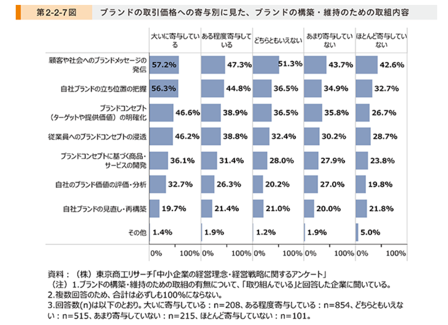 ・取引価格に「大いに寄与している」企業と「ほとんど寄与していない」企業を比較すると、「自社ブランドの立ち位置の把握」「ブランドコンセプトの明確化」において、回答割合に大きな違いがある。