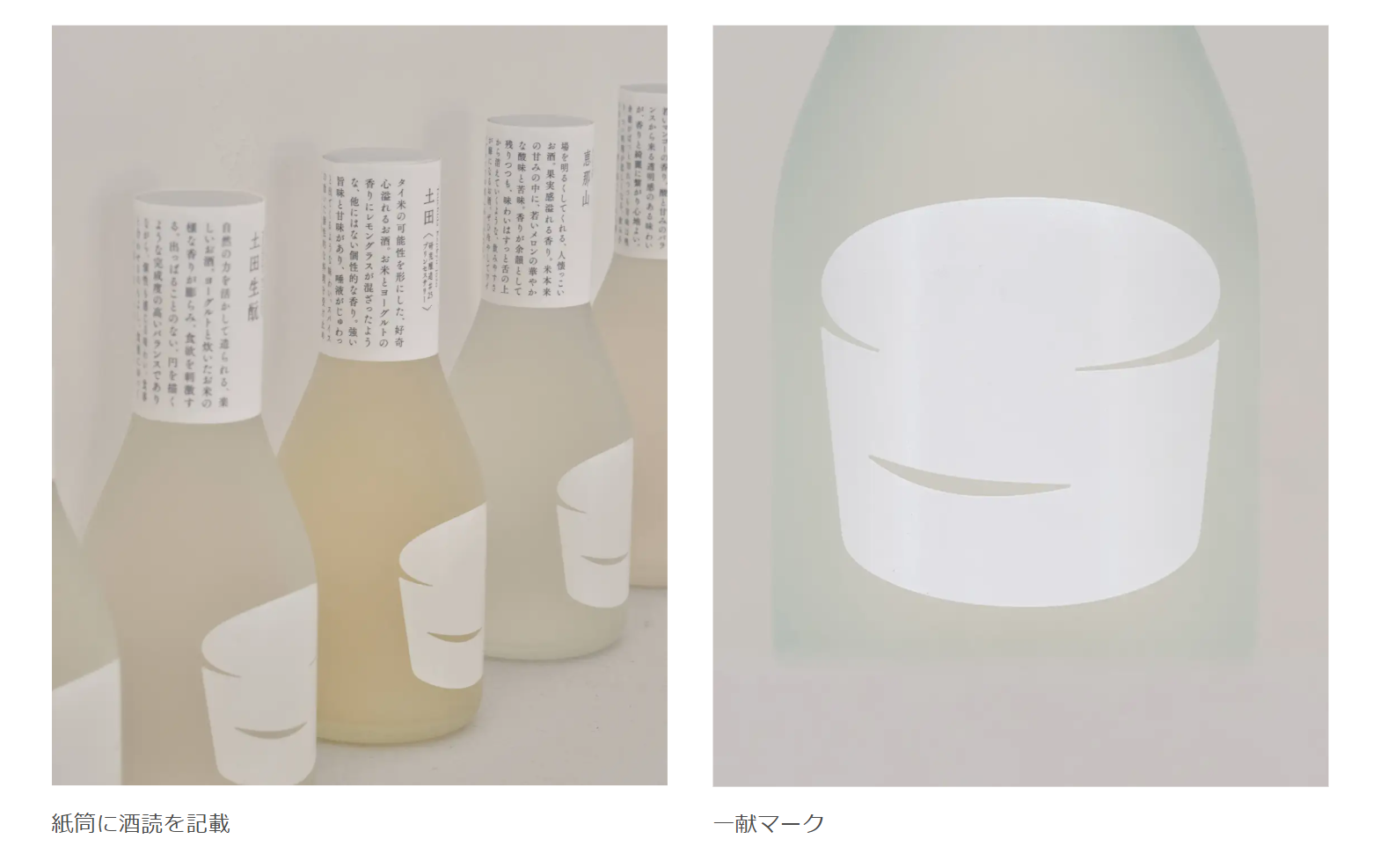 商品パッケージである瓶の特徴として、フロスト加工(ガラスや金属などの表面に細かい凹凸を施し、曇りガラスのような半透明の質感を与える加工技術)を施すことで、日本酒の繊細で美しい色彩差を認識できるようにしつつ、「一杯の酒。乾杯。」を意味する一献マークを象徴的に印刷しています。日本酒が元来持つ品格を残しながら軽やかな印象を付け加えることで、日本酒にこれまで親しみを持ちづらかった層にも受け入れやすいものにしています。また、各日本酒が持つ豊かなストーリー・味わい・飲み方を140字程度でまとめた酒読(さけよみ)を瓶首の紙筒に記載し、銘柄の個性を丁寧に伝えるパッケージにしています。 |