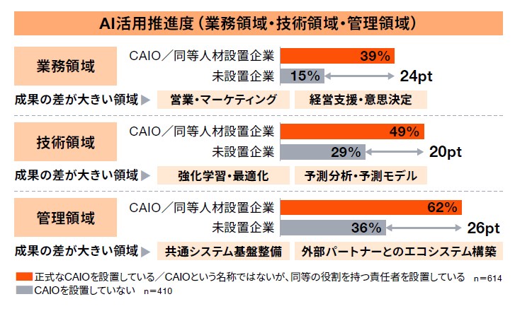 • ガバナンス専門のCAIO:「リスク管理・ガバナンス」を専門とするCAIOがいる企業は、AI活用の後退度が著しく低く、堅実な進捗を見せています。これはガバナンスがブレーキではなく、安全に加速させるための「ガードレール」として機能していることを示唆しています。