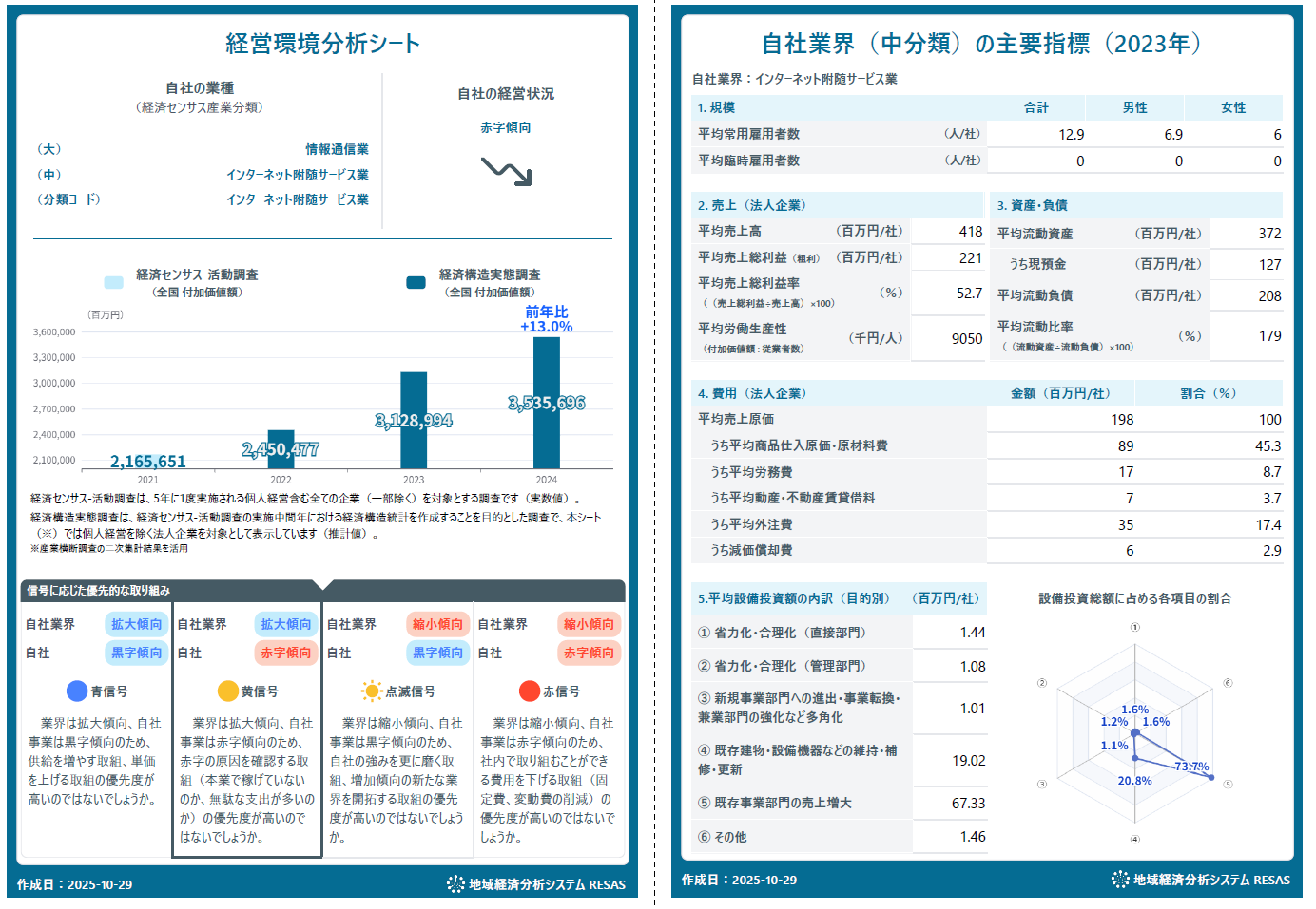 自社業界の経営環境を一目で確認できる「経営環境分析シート」に出力できる情報が大幅に強化され、付加価値額の経年推移や、業界の主要財務データを幅広く盛り込まれています。