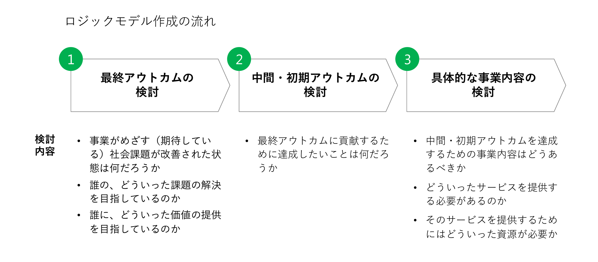 ロジックモデルは、事業により最終的に達成したい状況(=最終アウトカム、社会的インパクト)の検討からはじめ、その上で、その最終的に達成したい状況を実現するためには何が必要か、という観点から逆算して中間アウトカム、初期アウトカム、アウトプットや活動、そのために必要な資源を検討するフレームワークです。